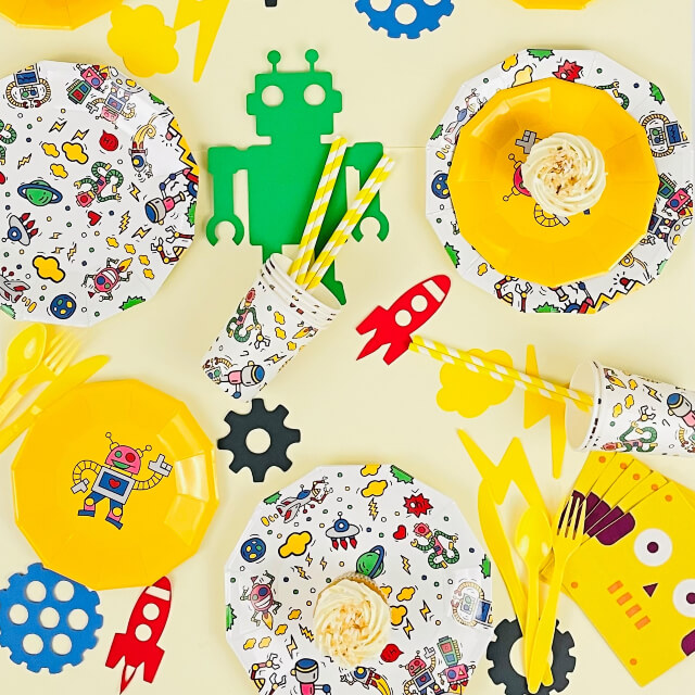 Robot themed party tableware for 8 guests includes: