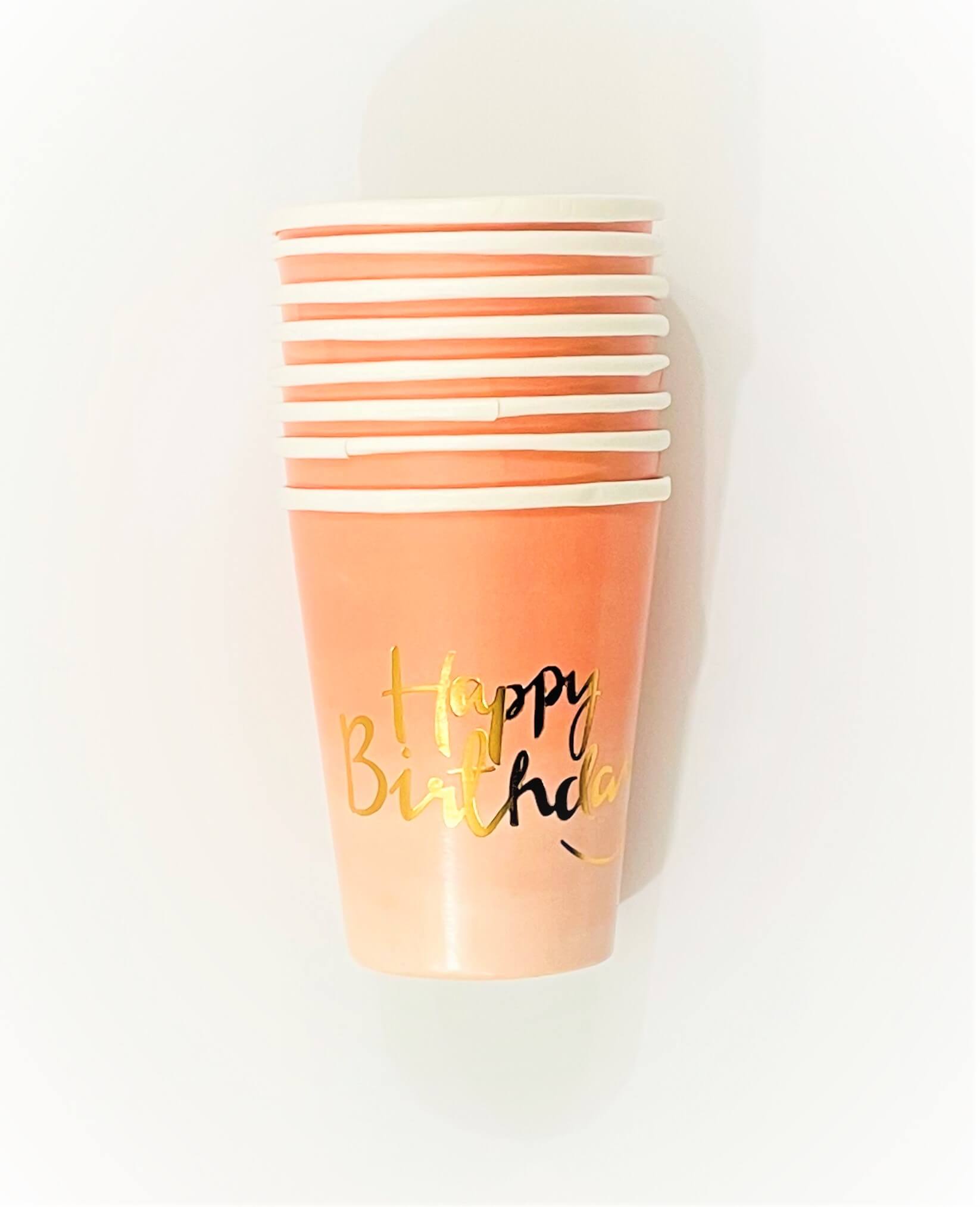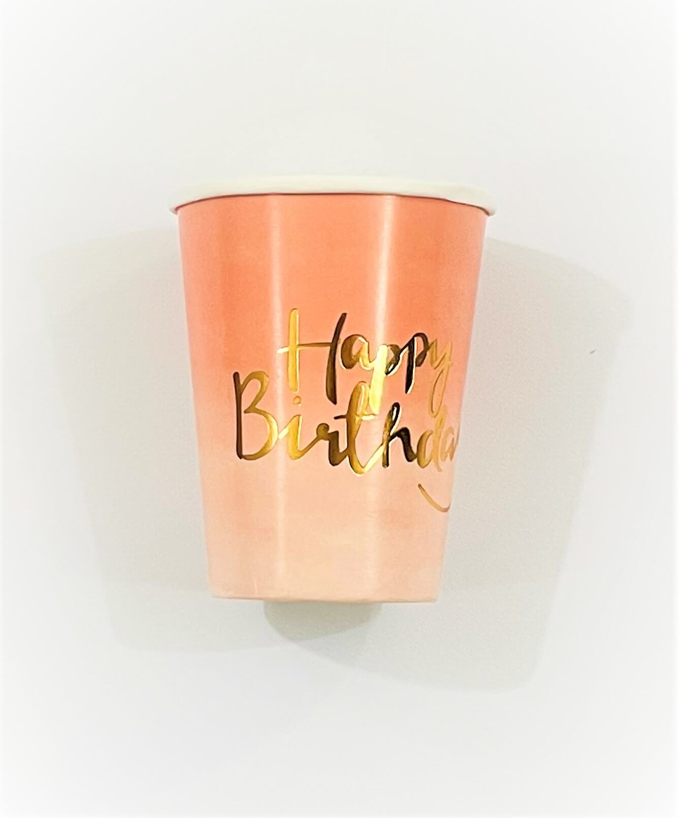 Trendy Happy Birthday rose gold cups are ideal for that elegant celebration. Make them feel special. Tableware includes plates and napkins.