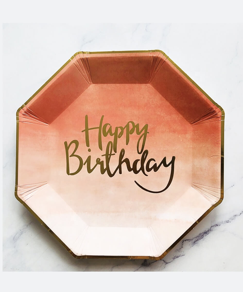 Trendy Happy Birthday rose gold large plates are ideal for that elegant celebration. Make them feel special. Tableware includes napkins and cups.