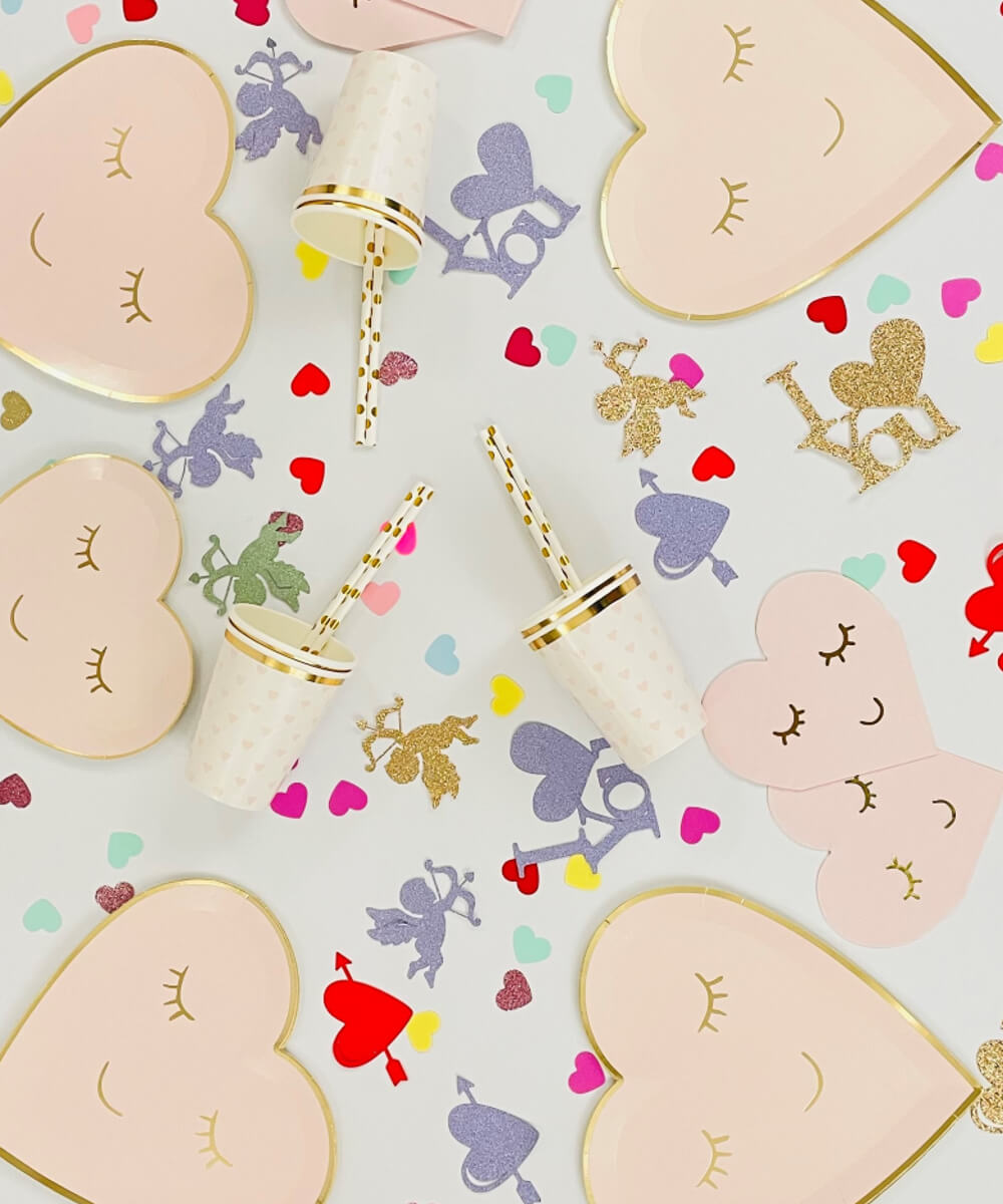 Valentines heart shaped tableware in pink is the perfect romantic addition for your celebration. Classy gold foil details in every piece. Show your love with this spectacular plates, napkins and cups. Perfect for Valentine’s, Weddings, Anniversary or any other occasion when love is the focus.